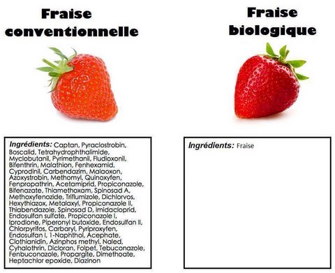 Ainsi en agriculture conventionnelle, une fraise n'est pas qu'une fraise c'est une fraise plus une partie des pesticides qu'elle a reçus et que le producteur offre en prime aux consommateurs et ce cocktail chimique offert pourrait faire une belle liste d'ingrédients à rajouter au simple mot fraise.