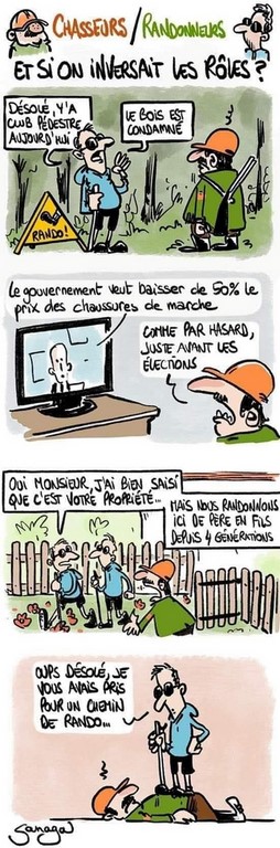Chacun d'entre nous a déjà vu ce panneau sur le bord des routes car il est obligatoire : les chasseurs doivent avertir des chasses. Toutefois ce simple panneau de sécurité fonctionne comme un véritable lapsus révélateur du problème que représente la chasse dans les campagnes françaises. A partir de la mi-septembre et pour 6 mois, la chasse est en cours, partout et tout le temps en cours, les chasseurs chassent les sangliers qui sont les vrais dangers signalés par le panneau et c'est aux habitants et aux autres usagers de la campagne d'être vigilants, de faire attention pour ne pas se faire tirer dessus. On voit là tout le discours de la Fédération nationale des chasseurs, discours très offensif depuis quelques années pour défendre un loisir moribond et contesté, sans jamais remettre en cause les chasseurs et la chasse auxquelles la société doit s'adapter. Cette inversion de la réalité, car ce serait normalement à la chasse de s'adapter à la société, invite à une autre inversion: partons à la chasse aux chasseurs...