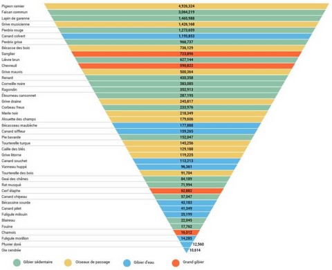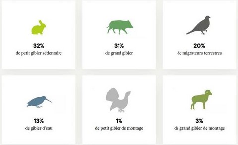 Ci-dessous une infographie sur la répartition du gibier sur l'année 2013-14 concernant uniquement la chasse au tir (manquent : chasse à courre, chasses traditionnelles et piégeages, vénerie sous terre, chasse au vol)