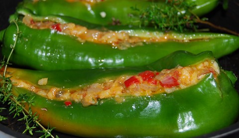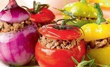 Attention, la viande n'est pas la farce. Pour une bonne farce, qui se tienne mais ne soit pas trop compacte, il faut suivre une règle : en volume (et non en poids), il faut un tiers de viande, un tiers de chair de légumes et d'herbes et un tiers de pain que ce soit du pain trempé à l'eau ou au lait et essoré ou de la chapelure. Les légumes, c'est-à-dire la chair des légumes évidés plus de l'oignon et de l'ail sont hachés et revenus doucement à l'huile d'olive pour rendre leur eau. On mélange ensuite légumes, viande, pain, sel, poivre et les herbes hachées (celles que l'on veut, en accord avec les légumes) sans oublier les oeufs si la viande est cuite. On farcit ensuite les légumes et on les dispose dans le plat huilé avec du thym, quelques gousses d'ail écrasées et un fond de bouillon de volaille d'eau ou de l'eau de végétation des légumes quand on les à creusés, surtout les tomates (5mm dans le fond du plat). On met ensuite au four à 180°c jusque à ce que ce soit cuit. Si les légumes sont gros on descend à 150°c et on rallonge la cuisson. On vérifie qu'il reste toujours du bouillon et on arrose au cours de la cuisson. La cuisson dépend de la viande employée : environ 1/2 h pour de la viande cuite, environ 1h pour de la crue.