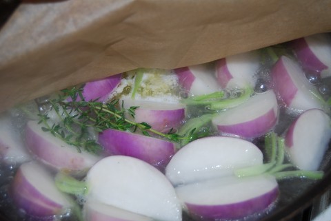 La peau s'en va d'elle-même et la cuisson est parfaite. On retrouve l'avantage de la croûte de sel mais avec deux avantages à mon gôut : c'est un peu moins salé et surtout on ne gâche pas de sel.