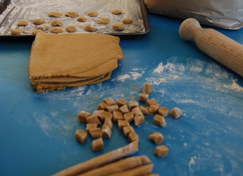 Faire une pâte brisée avec 250g de farine, 3 CS d'huile d'olive et un peu d'eau. Mélanger rapidement pour obtenir une boule. La réserver une heure au réfrigérateur. Préparer une farce maigre de bettes. Etaler le plus finement possible la pâte brisée et la découper en ronds de 8 à 10cm de diamètre (avec un verre ou un bol). Sur chaque rond, déposer de la farce au centre en laissant 1 cm de pâte libre. Humidifier à l'eau le bord restant et plier en deux, coller les bords en appuyant fortement.