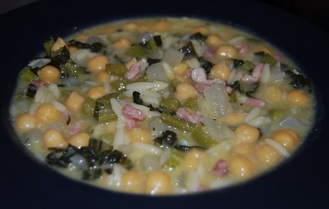 Pour 3-4 personnes, prendre 250g de pois chiche cuits. Faire blondir voire roussir 1 oignon émincé avec un peu de beurre (une occasion unique de séparer le pois chiche de l'huile d'olive), puis rajouter 1 gousse d'ail hachée. Mouiller avec du bouillon de volaille et un verre de lait. Si vous avez, vous pouvez mettre une crôute de parmesan à cuire dans la soupe. Faire cuire une demi-heure et mixer finement au mixer plongeant. Goûter et rectifier en sel et poivre. Servir ainsi.
