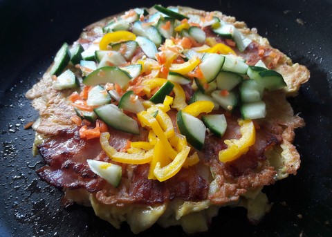 Pour remplacer la garniture traditionnelle de l'okonomiyaki, faite de produits japonais, je préfère tailler finement quelques légumes de saison plutot que d'essayer de remplacer l'irremplaçable : il n'y aurait pas de sens à mettre des lamelles de truite fumée à la place des pétales de bonite séchée ou de la mayo à la place de la mayonnaise japonaise. Donc pour ma part, un peu de piment végétal (doux), une herbe comme de ciboulette ou de l'estragon, un peu de ciboule ou de poireau ciselé, une peu de concombre si c'est la saison, quelques lamelles de champignon de Paris cru...