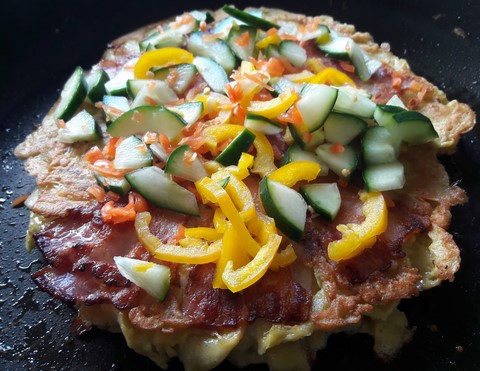 Comme légumes, prendre toutes les légumes verts de printemps disponibles : des épinards, du vert de bettes, de la cote de bettes taillées en dés, de l'aillette, des oignons verts nouveaux, les premières fèves ou les premiers petits pois, des jeunes poireaux, un bouquet de persil, de plantain corne de cerf, de roquette, les fanes des premiers radis et un peu de toutes herbes aromatiques qui repoussent : ciboulette, estragon, oseille... Ciseler toutes les feuilles en lanières ainsi que les aillettes et les oignons blancs. Ebouillanter les pois ou les fèves. Mélanger bien tous les légumes avec 2 oeufs entiers, 50g de parmesan râpé, 6 CS d'huile d'olive, sel et poivre.