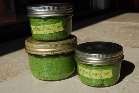 - le beurre vert : mêmes ingrédients, même façon de faire mais on met les herbes dès le début dans le mixeur et on mixe jusqu'à ce que les herbes aient disparu pour laisser place à un beurre vert.