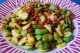 Les cosses de fèves quand elles sont jolies sont délicieuses et traditionnellement consommées en Espagne d'où vient cette recette. Pour cela, il faut bien sûr éplucher les cosses en enlevant les bouts et les parties latérales dures avec un petit couteau pour obtenir des longs rectangles bien nets. Réserver dans de l'eau froide pour que les cosses se tortillent.