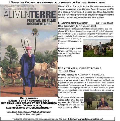 Cette année 2015, l'Amap des Courgettes organise donc pour la 2e fois le Festival Alimenterre à Montluçon à travers 2 soirées de débats et de films, les mardis 3 et 17 novembre à 20h à la salle Saint-Jean à Montluçon.