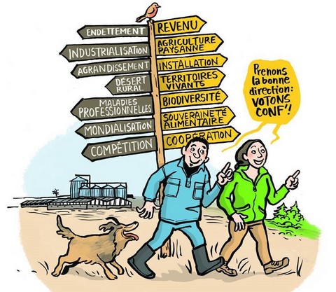 Pour la Conf, il faut une agriculture paysanne, c'est-à-dire des paysans nombreux et solidaires dans des exploitations de taille raisonnable qui puissent vivre de leur travail et y trouver du sens : ils doivent produire pour nourrir la société, c'est-à-dire produire une nourriture saine de manière respectueuse de l'environnement, des ressources dont le sol, des paysages et du bien-être animal. Cela doit permettre une agriculture humaine, écologique, vivable, qui permet la souveraineté alimentaire, c'est-à-dire la capacité de maîtriser son alimentation, et qui fait vivre les campagnes dans un lien entre paysans, et entre paysans et population. Pour cela, il faut une agriculture qui vise plus d'autonomie sur la ferme en limitant les facteurs de dépendance (intrants, emprunts trop lourds) et il faut gérer les volumes de production pour que chacun puisse travailler avec des prix rémunérateurs. Enfin l'agriculture n'est pas qu'un travail isolé de production sur la ferme : elle doit être pensée par rapport aux enjeux de la société (local, national, global) car l'agriculture est une question de société qui irrigue et donne du sens au travail de la ferme dans une logique local-global.