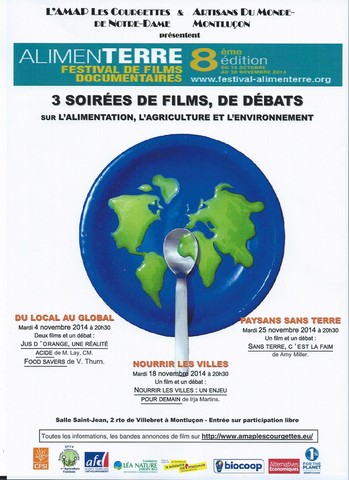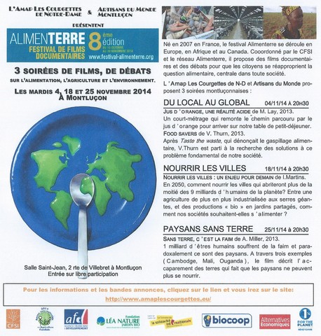 Cette année 2014, l'Amap les Courgettes de Notre-Dame a organisé, avec l'aide de l'Association Artisans du Monde- Montluçon, le Festival Alimentaire à Montluçon à travers 3 soirées de débats et de films, les mardis 4, 18 et 25 novembre à 20h30 à la salle Saint-Jean.