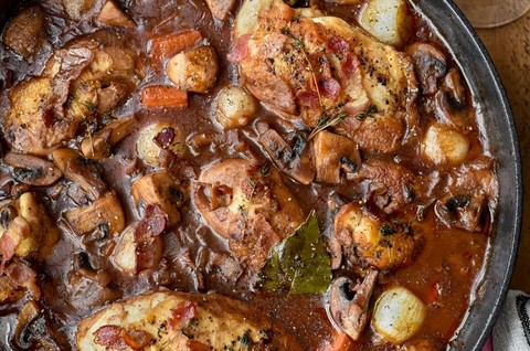 Coq au vin, Mille-feuille de bettes et écrasé de pommes de terre aux olives noires séchées