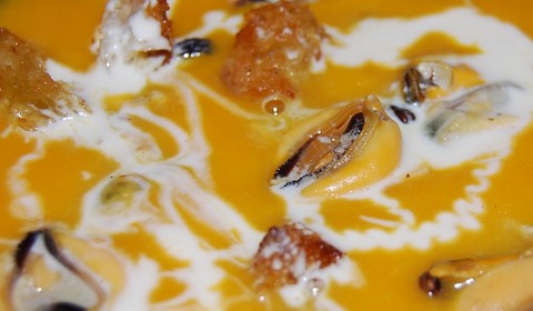 - sans la soupe prête : peler 1 kg de courge muscade ou sucrine et la couper en dés. La faire fondre au beurre dans une sauteuse et quand les morceaux sont ramollis, mouiller avec le jus des moules et compléter avec un demi-verre de lait. Laisser cuire à couvert à feu moyen. Quand les morceaux sont cuits, mixer avec une râpée de muscade et une cuillerée à soupe de crème fraîche, rectifier si besoin est en sel et poivre mais le jus des moules suffit normalement à assaisonner. Vous devez obtenir une sauce onctueuse.