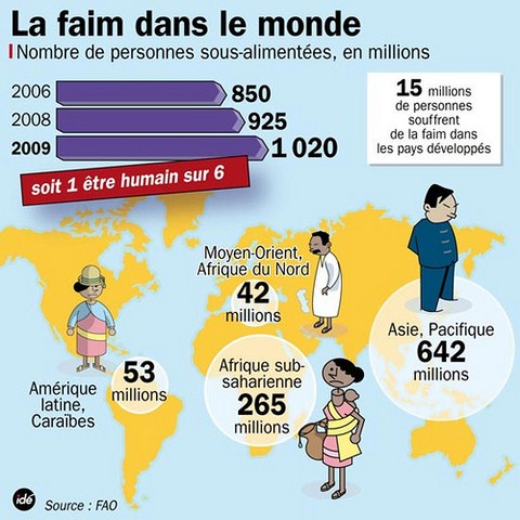 En 2009, le chiffre record a été atteint : on a dépassé le milliard de personnes souffrant de sous-nutrition, c'est-à-dire qui n'ont pas assez à manger pour couvrir leurs besoins énergétiques. (Pour tous ceux qui ne s'imaginent pas ce qu'est 1 milliard, un simple petit exercice : pour compter ce milliard d'affamés au rythme de 1 toutes les secondes, il vous faudra 31 ans et 3 mois pour finir de compter)