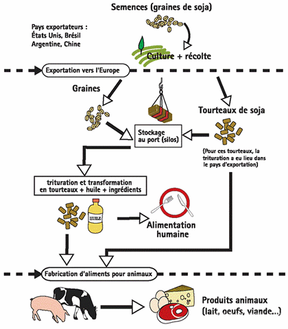 En effet les céréales ne suffisent pas et l'élevage intensif consomme aussi 85% du soja mondial, le pourcentage restant servant principalement aux agrocarburants, faisant de cet aliment si nutritif une production presque inutile en terme d'alimentation humaine. Au niveau français, l'appétit de nos veaux, vaches, cochons, couvées touchent aussi le soja puisque l'élevage intensif français est le premier importateur européen qui fait venir 4,5 millions de tonnes chaque année et 22% du soja brésilien (OGM) pour compléter notre production de colza qui passe aussi en grande partie dans notre élevage.
