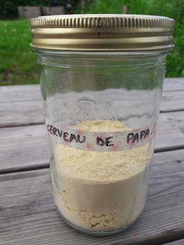 La photographie montre le bocal de farine de pois chiche mais rebaptisée par ma fille...