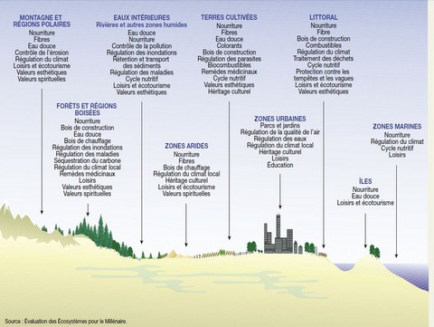 Les écosystèmes sont nombreux à la surface du globe. Le dessin ci-dessus liste les grand types d'écosystèmes mondiaux et les différents services qu'ils rendent. Pour bien comprendre l'ensemble des bienfaits apportés par un écosystème, prenons l'exemple de la forêt. Rappelons d'abord que ce schéma résultant du MEA est synthétique : la forêt n'existe pas, il y a de très nombreux écosystèmes forestiers qui rendent tous des services différents et le but de ce schéma n'est que de lister les services des écosystèmes forestiers dans leur globalité. Pour l'exemple on se concentrera sur les écosystèmes forestiers tempérés occidentaux.