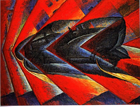 Cette pensée techniciste éprise de vitesse que contient l'idée de progrès a débordé dans tous les domaines. En art on la retrouve dans un courant comme le futurisme auquel appartient le tableau de Russollo (ci-dessus) qui célèbre l'automobile et la vitesse. En agriculture, l'idéologie de progrès est au centre de l'idée, abérrante sans elle, de faire grandir un animal ou une plante deux fois plus vite. Le vivant doit se plier à la technique et la technique doit supprimer l'aléatoire inhérent au vivant. Une ferme usine ou une ferme hydroponique ne sont rien d'autre que l'application agricole de cette idéologie : traiter le vivant par le progrès technique pour supprimer l'aléatoire et gagner en vitesse.
