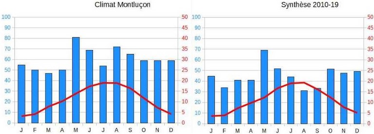 Ainsi, aussi inattendu que cela puisse être, Montluçon a eu sur la période 2010-19 un climat subméditerranéen avec 1 mois de sécheresse estival (presque 2) et des régimes des pluies et des températures correspondant à ceux de villes de climat méditerranéen. C'est peut-être un atout touristique à développer mais un tel épisode ne peut qu'avoir des conséquences sur la végétation.