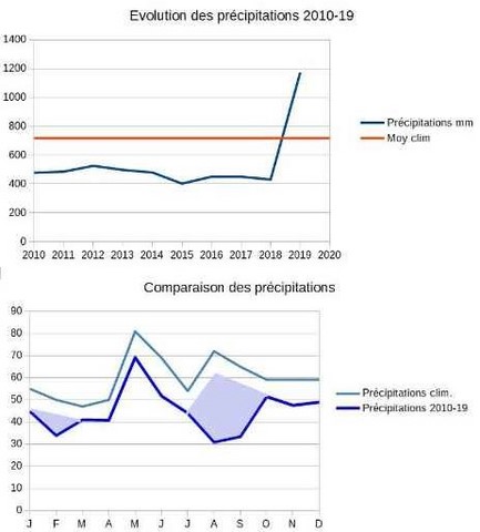 Le premier graphique est sans appel : si on excepte 2019 les précipitations annuelles sont très inférieures à la moyenne climatique qui est de 720mm annuels alors que sur 2010-2018, les précipitations annuelles ont été entre 500 et 400mm soit 30 à 45% de précipitations en moins chaque année. C'est énorme. Toutefois 2019 (comme 2020 même hors période d'étude) a été beaucoup plus pluvieuse avec presque 1200mm. (Ce chiffre est tellement différent que j'ai cru d'abord a une erreur statistique mais il est confirmé par les chiffres des communes environnantes qui montre un même décrochage et des valeurs proches). Il faut donc bien voir comment cela va évoluer et savoir si la norme va devenir ces années sèches ou s'il s'agit juste de plus d'instabilité avec des suites d'années très sèches alternant avec des suites d'années pluvieuses s'approchant ainsi de la moyenne climatique sur 30 ans. Il n'empêche que sur ces années 2010-2018 ce déficit hydrique de 30 à 45% chaque année est une modification profonde du climat local.