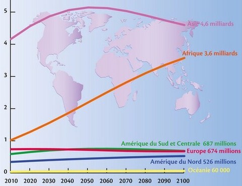 Les autres parties du monde n'ont pas connu l'amélioration des conditions de vie en même temps et donc leur transition démographique s'est faite plus tardivement mais parfois plus rapidement comme le montre le graphique ci-contre. C'est le cas de l'Océanie, de l'Amérique du sud et même de l'Asie qui devrait l'avoir achevée dès 2040 et voir sa poulation baisser. Bonne nouvelle car l'Asie c'est la moitié de la population mondiale.