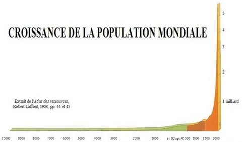 C'est ce que montre le 2e graphique (cliquez dessus en dessous de l'image). Il change d'échelle temporelle et considère la population mondiale depuis -10000. De -10000 à l'an O, l'humanité n'augmente pas : la population reste stable. A cette échelle historique la stabilité ou une croissance très faible est la norme et l'augmentation actuelle depuis le XVIIIe siècle est ce qu'on appelle un accident, une situation anormale. Comment s'explique-t-elle?