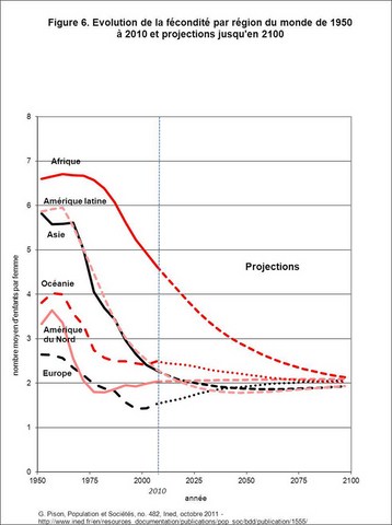 Le mouvement de baisse de la fécondité est d'ailleurs amorcé sur tous les continents y compris en Afrique ce qui est plutôt une bonne nouvelle comme le montre le graphique. Pour qu'il ait la même rapidité qu'en Asie et en Amérique latine, il faut s'efforcer de développer la scolarisation des filles.