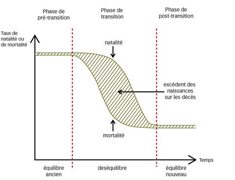 L'amélioration des conditions de vie se fait d'abord par l'alimentation et l'hygiène puis la santé. On entre alors dans la transition démographique car ces trois facteurs entrainent une baisse rapide de la mortalité. La natalité, elle reste stable car elle répond aussi à des facteurs culturels (habitude des familles nombreuses, traditions...). La mortalité plonge, la natalité reste forte ce qui entraine un fort accroissement naturel et un explosion de la population.