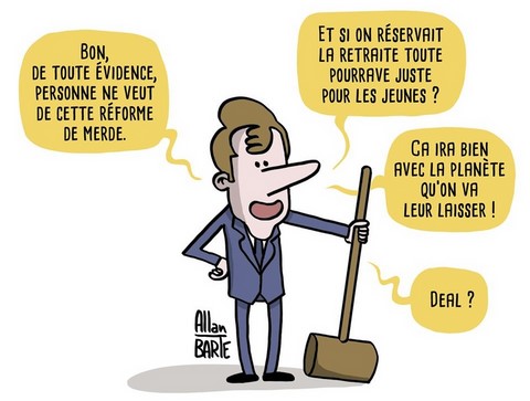Les illustrations sont d'Allan Barte, un dessinateur d'actualité de grand talent et qui a eu la gentillesse de m'autoriser à les utiliser. Qu'il en soit remercié ainsi que pour son travail aussi drôle que précis.