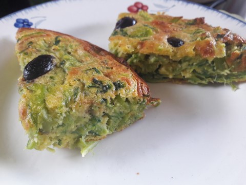 Comme légumes, prendre toutes les légumes verts de printemps disponibles : des épinards, du vert de bettes, de la cote de bettes taillées en dés, de l'aillette, des oignons verts nouveaux, les premières fèves ou les premiers petits pois, des jeunes poireaux, un bouquet de persil, de plantain corne de cerf, de roquette, les fanes des premiers radis et un peu de toutes herbes aromatiques qui repoussent : ciboulette, estragon, oseille... Ciseler toutes les feuilles en lanières ainsi que les aillettes et les oignons blancs. Ebouillanter les pois ou les fèves. Mélanger bien tous les légumes avec 2 oeufs entiers, 50g de parmesan râpé, 6 CS d'huile d'olive, sel et poivre.