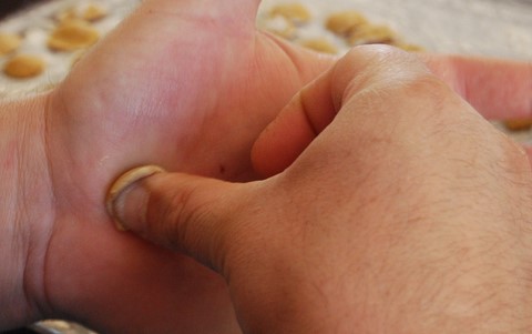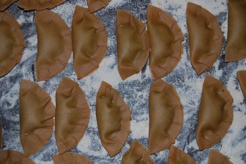 Faire une pâte brisée avec 250g de farine, 3 CS d'huile d'olive et un peu d'eau. Mélanger rapidement pour obtenir une boule. La réserver une heure au réfrigérateur. Préparer une farce maigre de bettes. Etaler le plus finement possible la pâte brisée et la découper en ronds de 8 à 10cm de diamètre (avec un verre ou un bol). Sur chaque rond, déposer de la farce au centre en laissant 1 cm de pâte libre. Humidifier à l'eau le bord restant et plier en deux, coller les bords en appuyant fortement.