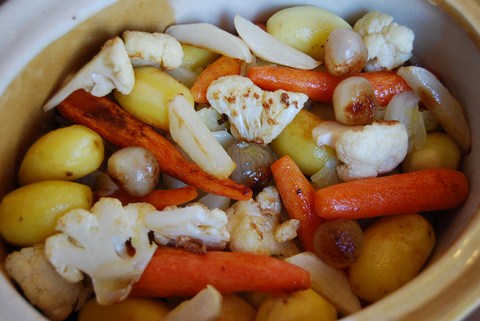 La recette : des beaux légumes d'hiver entier, brossés, lavés mais non épluchés que l'on pose sans matière grasse dans la terrine avec quelques épices si l'on veut et un peu de gros sel. Soit un seul légume soit un assortiment. On ferme et on enfourne. On sort alors de beaux légumes confits entiers que l'on épluche facilement.