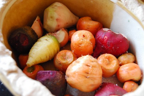 Passons à la pratique : on épluche (ou pas) les légumes de saison, c'est-à-dire du panier, en prévoyant une petite quantité de chaque (chaque convive devant trouver 1 ou 2 morceaux de chaque légume, pas plus). On suit ici l'adage d'Alain Passard qui veut que les légumes de saison s'accordent toujours, donc tentez tout. On les taille joliment en prenant de soin de mettre en morceaux un peu plus gros ceux qui cuisent plus vite mais on évite de toutes façons les petits bouts non identifiables : on veut voir et manger de beaux légumes. Dans ces légumes on oublie pas les condiments comme échalotte, ail en chemise, petits oignons. Dans une grande poêle, on fait revenir les légumes dans le corps gras de son choix en fonction des légumes et de la saison. Cette étape est importante et c'est la seule qui demande du travail alors on ne met pas trop de légumes dans la poêle, en une seule couche et sans qu'ils se touchent pour qu'ils saisissent correctement. On peut le faire en plusieurs fois. Au fur et à mesure que les légumes colorent (ils n'ont pas besoin d'être cuits), on les sort et on les dispose joliment dans une cocotte ou dans des cocottes individuelles. Les cocottes peuvent être en fonte ou en terre. On assaisonne alors avec sel et poivre, un peu de thym ou de laurier, l'épice de son choix (même si selon moi les légumes se suffisent) et on arrose avec un peu de bouillon de volaille, de légumes (faits avec les épluchures) ou un peu d'eau pour en avoir un demi cm en fond de cocotte. Les plus gourmands iront même jusqu'à rajouter 1 petit morceau de lard grillé par convive. On peut arrêter ici la recette pour faire la dernière étape une petite heure avant le repas. On couvre ensuite la cocotte et on la met à four doux (150°c) jusqu'à ce que les légumes soient cuits (on pique). La cocotte peut ensuite rester dans le four éteint. On sert avec le couvercle pour l'effet parfum à l'ouverture.