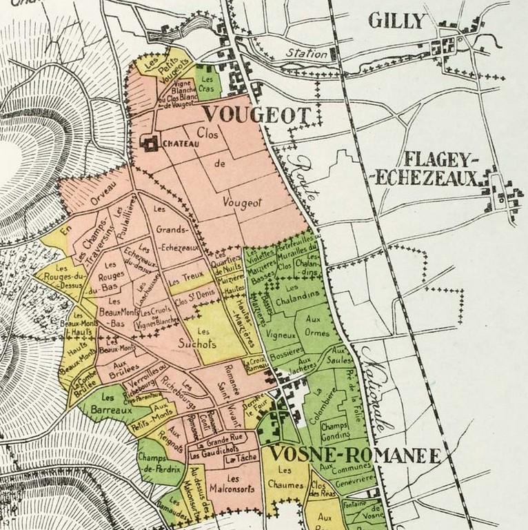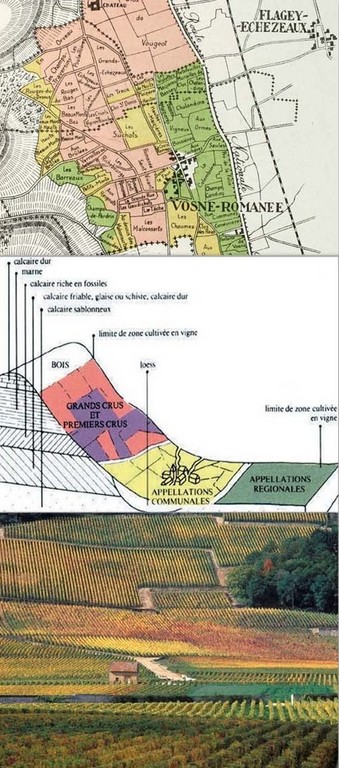 Pour bien comprendre cela, penchons-nous sur une idée bourguignonne devenue patrimoine mondiale de l'Unesco en 2015 : les climats bourguignons. Cette idée va plus loin que celle de terroir et permet de comprendre ce qu'est le vin. La carte ci-contre (que vou pouvez agrandir sous l'image) montre les climats de Vougeot et Vosne-Romanée deux villages qui abritent parmi les plus grands Bourgognes. Chaque parcelle avec un nom est un climat et produit un vin différent de celle d'à-côté. La côte bourguignone abrite plus de 1000 climats différents sur une mince bande de coteau allant du sud de Dijon au sud de Beaune. Cette différence entre deux climats voisins ne vient pas de la vinification mais des composantes de la parcelle.