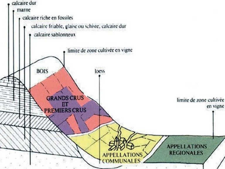 L'inclinaison de la parcelle, son orientation fine, le débouché d'une combe qui permet les vents d'ouest, l'abri d'un vieux mur, d'une haie, d'un bosquet ou une situation protégée dans le village, la composition du sous-sol entre les différents calcaires (voir image 2 à agrandir sous la photo principale), la proximité ou non d'un de ces petits rus qui courent sous la surface... Tous ces éléments donnent un biotope particulier à chaque parcelle. Dans ces différents biotopes, travaillés depuis au moins 5 siècles dans des parcelles quasiment inchangées, se sont développés des biocénoses (ensemble des êtres vivants d'un milieu) différentes. Les insectes ne seront pas les mêmes dans un climat ou un autre. Surtout ce seront les bactéries et les champignons du sol qui seront très différents d'un climat à un autre faisant évoluer le sol, la vigne et le raisin différemment. Quand on associe tous ces facteurs, on trouve la notion de climat, chaque climat est un écosystème différent qui tout en finesse et en nuance va permettre une multitude d'expressions de ce même cépage pinot noir à quelques mètres d'écart. Ces climats se voient même sur la photo ci-contre. En début d'automne, chaque parcelle portant pourtant le même cépage se teinte différemment et à des moments différents faisant de la'"Côte d'Or" une côte bien plus riche aux multiples couleurs.