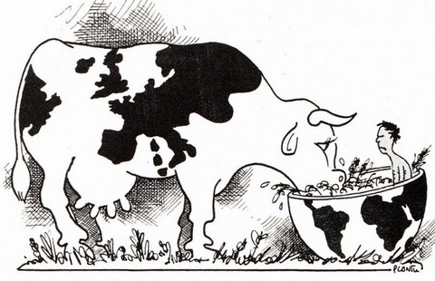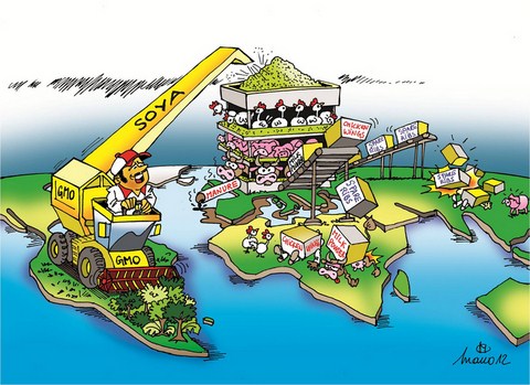 Deuxième problème, ce ne sont pas les mêmes qui mangent : on importe les céréales et protéagineux du sud pour nourrir les animaux du nord qui nourriront les populations du nord. Cet élevage industriel du nord qui ne peut nourrir seul ses animaux prive le sud de céréales dont il pourrait se nourrir. Ainsi les seules céréales consommées en une année par l'élevage nord américain très industrialisé pourraient nourrir 840 millions de personnes pendant une année c'est-à-dire tous ceux qui souffrent de la faim dans le monde (Données). Cette production de céréales et de protéagineux dans les pays du sud pour nourrir le bétail du nord est d'ailleurs en train de passer une étape puisqu'après avoir affamé l'Amérique du sud (Et si on parlait vertement du Brésil), elle s'installe désormais aussi en Afrique qui est déjà le continent de la faim et va connaître en plus d'une forte d'un croissance démographique, ce fléau de l'agriculture fourragère d'exportation.