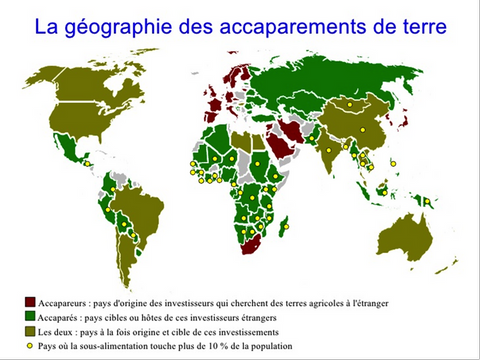Ce mouvement d'accaparement des terres, souvent peu connu, est massif depuis la crise de 2008, les spéculateurs quittant une fois de plus les marchés qu'ils ont fait s'écrouler par leur spéculation pour aller spéculer dans des terres plus fertiles et cette fois-ci au sens propre. Entre 2008 et 2011, selon les Nations unies, ce sont 30 millions d'hectares de terres, soit la surface agricole de la France, qui ont été achetés ou loués par des capitaux étrangers. AU total on l'estime à près de trois foi cette surface et selon l’ONG Oxfam, une superficie équivalent à celle de Paris est vendue à des investisseurs étrangers toutes les 10 heures dans les pays pauvres.Si l'on regarde la carte ci-contre (cliquez et agrandissez), la géographie de ces accaparements est sans appel : les pays riches (pays du nord et pays pétroliers) achètent les terres des paysans du sud. Deuxième enseignement de cette carte : l'accaparement des terres touchent les pays où la sous-alimentation frappe au moins 10% de la population. Le lien accaparement famine ne peut être plus évident.