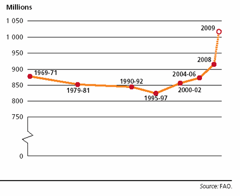 En 2009, le chiffre record a été atteint : on a dépassé le milliard de personnes souffrant de sous-nutrition, c'est-à-dire qui n'ont pas assez à manger pour couvrir leurs besoins énergétiques. (Pour tous ceux qui ne s'imaginent pas ce qu'est 1 milliard, un simple petit exercice : pour compter ce milliard d'affamés au rythme de 1 toutes les secondes, il vous faudra 31 ans et 3 mois pour finir de compter)