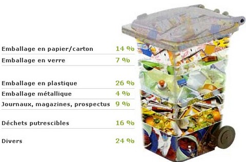 Comme le montre l'image ci-dessus, une grande partie de nos poubelles peut être réutilisée. C'est le cas pour les 14% d'emballage papier carton qui serviront à refaire du carton. Les 7% de verre sont refondus pour refaire du verre et ce, quasiment à l'infini. De même, pour les 4% de métal qui referont des objets métalliques. Quant aux 9% de journaux et prospectus, ils permettront de refaire du papier. Les 26% d'emballages plastiques sont de deux sortes : toutes les bouteilles et contenants qui se ferment et qui sont recyclés en France et les autres tels que les pots de yaourt qui ne le sont pas et posent donc problème. Les déchets putrescibles sont bien entendu recyclables par compostage que ce soit individuel quand on a un jardin ou collectif dans certaines villes qui font du ramassage de déchets compostables.