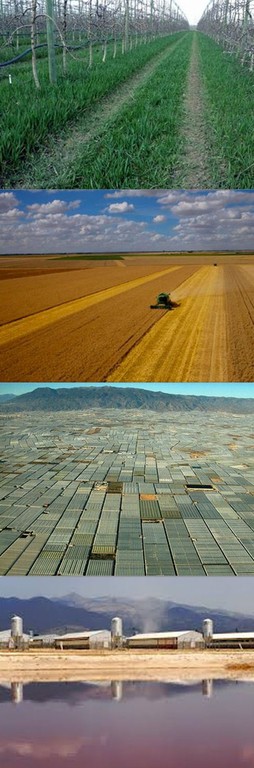 Elévage intensif, maraîchage et horticulture productivistes transforment complètement le paysage en paysage artificiel voire industriel puisque ces agricultures sont hors-sol, sous hangar ou sous serre. Le paysage agricole n'est plus vert, plus végétal : il est métallique, plastique ou verrier, composé de bâtiments identiques reproduits à l'infini le long de nombreux axes de transport pour camions. Les deux dernières images montrent ce que donnent cette agriculture. L'élevage industriel conduit à une succession de hangars alignés le long de routes. Le maraîchage intensif sous serre a transformé le paysage dans lequel ont été tournés certains westerns de Sergio Leone en une gigantesque mer de plastique située près d'Alméria en Andalousie. C'est le "jardin" de l'Europe qui produit tous les légumes et fraises marqués Espagne.
