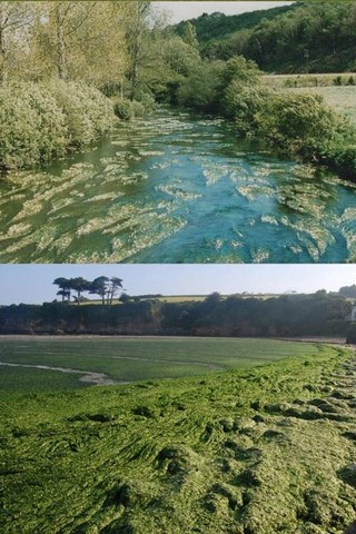 La photographie du milieu montre une rivière bretonne. La pollution n'est pas visible mais les herbes (et non des algues sur l'image) surabondantes le sont. Ces herbes n'ont rien de naturelles. Normalement une rivière bretonne c'est une eau assez claire qui court sur du granit, d'où une eau légèrement acide, ce qui donne un milieu pauvre en plantes et en en matières organiques, propice aux salmonidés. La rivière de l'image est eutrophisée : les nitrates venant de l'épandage des lisiers d'élevage ont modifié la rivière entrainant la prolifération des plantes (ici des renoncules aquatiques). Leur décomposition annuelle surcharge la rivière en matière organique, l'envase et ralentit progressivement son cours entrainant la disparition des salmonidés. Ce sont tous ces problèmes que dénoncent depuis longtemps une association comme Eaux et rivières de Bretagne dont vous pouvez consulter le site : http://www.eau-et-rivieres.asso.fr/. (Leurs "photos du mois" sont particulièrement édifiantes). L'exemple de ces rivières bretonnes montre que l'agriculture peut modifier ou détruire des paysages et des écosystèmes même à distance.