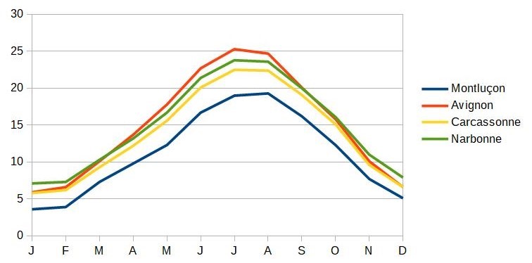 En terme de température, Montluçon n'a que peu changé comme nous l'avons vu à part des épisodes caniculaires en été et des moments d'hiver doux. Ses caractéristiques thermiques ne sont toutefois pas très éloignées si l'on compare avec des villes de climat méditerranéen (image 4 à cliquer). Le régime des températures (c'est-à-dire l'évolution des températures sur l'année) est le même que dans le climat méditerranéen mais environ 5°c au-dessous. Pour Henri Gaussen, le climat est méditerranéen si les températures moyennes sont positives toute l'année, ce qui est le cas de Montluçon. Pour Köppen, le climat est méditerranéen si le mois le plus froid est entre -3 et 18°c, si 4 mois consécutifs ont plus de 10°c et si le mois plus chaud est à plus de 22°c de moyenne. Ces 3 conditions sont remplies par celui de Montluçon sur 2010-2019 qui présente en plus le même régime des températures que les villes méditerranéennes. Toutefois les températures ne sont pas une clef du climat méditerranéen aussi importante que les précipitations.