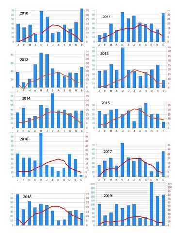 Le premier graphique est sans appel : si on excepte 2019 les précipitations annuelles sont très inférieures à la moyenne climatique qui est de 720mm annuels alors que sur 2010-2018, les précipitations annuelles ont été entre 500 et 400mm soit 30 à 45% de précipitations en moins chaque année. C'est énorme. Toutefois 2019 (comme 2020 même hors période d'étude) a été beaucoup plus pluvieuse avec presque 1200mm. (Ce chiffre est tellement différent que j'ai cru d'abord a une erreur statistique mais il est confirmé par les chiffres des communes environnantes qui montre un même décrochage et des valeurs proches). Il faut donc bien voir comment cela va évoluer et savoir si la norme va devenir ces années sèches ou s'il s'agit juste de plus d'instabilité avec des suites d'années très sèches alternant avec des suites d'années pluvieuses s'approchant ainsi de la moyenne climatique sur 30 ans. Il n'empêche que sur ces années 2010-2018 ce déficit hydrique de 30 à 45% chaque année est une modification profonde du climat local.